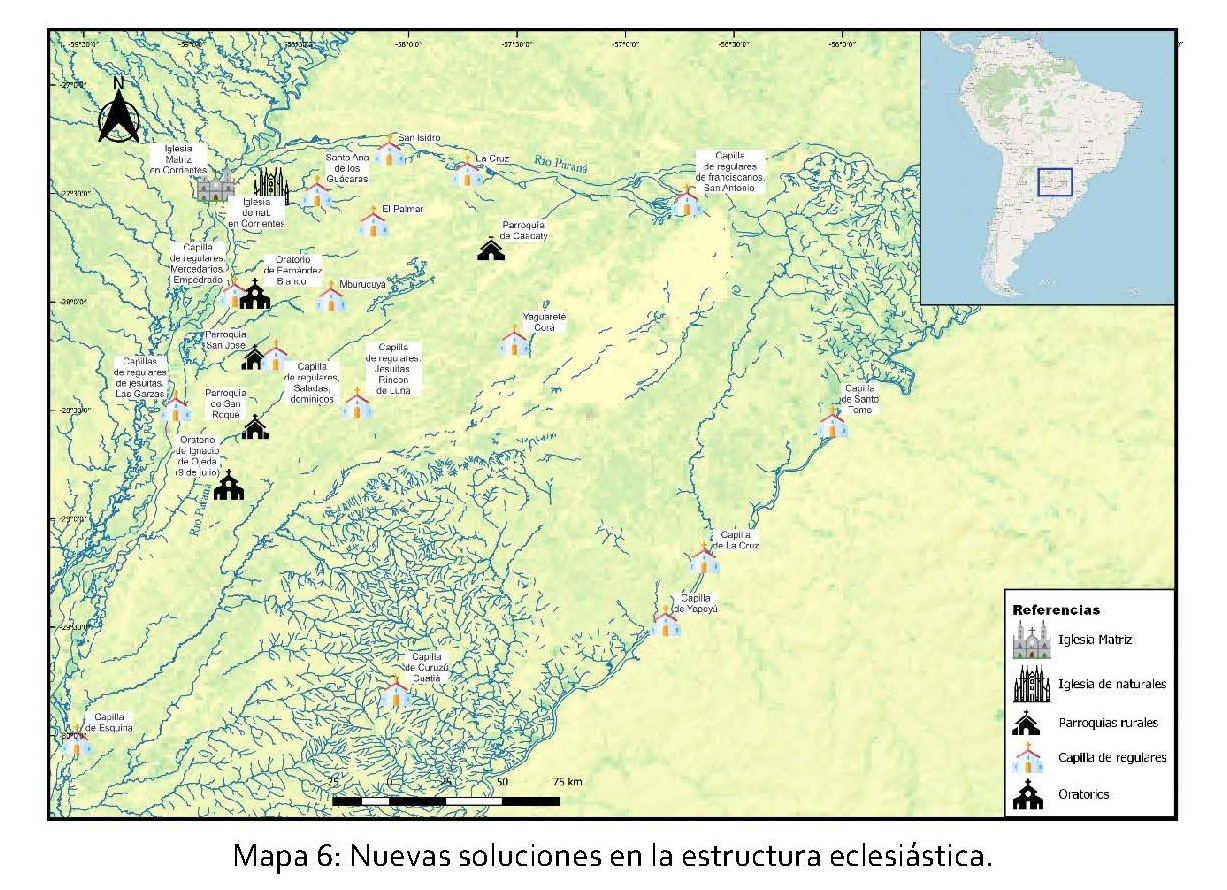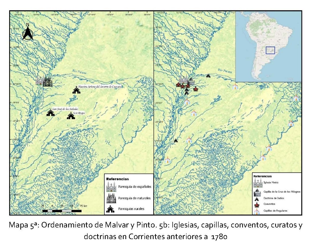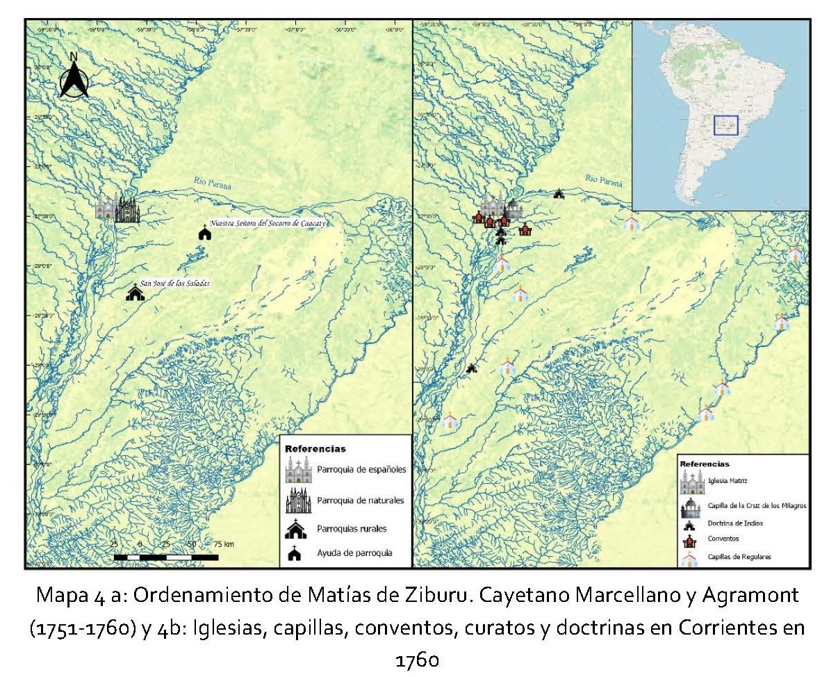 En este artículo, exploraremos el funcionamiento de la región eclesiástica configurada en el territorio de Corrientes, ciudad de la gobernación de Buenos Aires, desde la fundación en 1588 hasta 1810. Este análisis nos permitirá dar cuenta de la red de parroquias, oratorios e iglesias que se constituyeron tras las visitas pastorales y observar cómo las mismas dieron respuestas a los requerimientos de la población local. Más allá de un análisis institucional, nuestro objetivo es visualizar espacialmente cómo convivían agencias eclesiásticas múltiples (informales) y, verificar la permeabilidad y yuxtaposición de las jurisdicciones. De esa forma rastrearemos cómo las capillas u oratorios atendían a fieles, aunque no constituían formalmente una parroquia, y en ese contexto, cómo los franciscanos, mercedarios, jesuitas y dominicos colaboraban en satisfacer las demandas religiosas de la población.