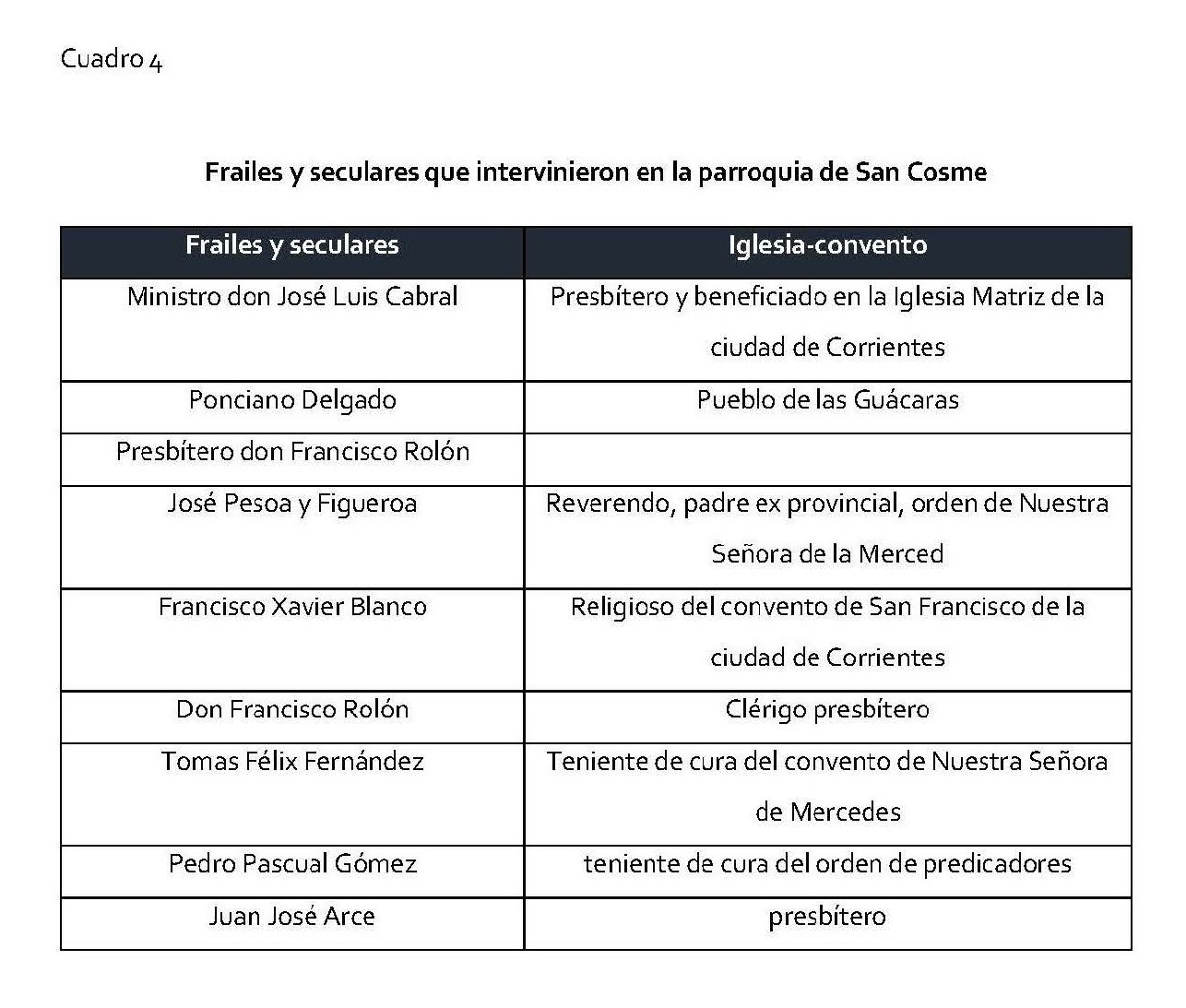También contrastaremos datos históricos que nos permitirán brindar un conocimiento cartografiado de la estructura eclesiástica correntina a partir de información de las visitas pastorales, documentación institucional de la ciudad como ser las actas del cabildo y otros datos tomados de las actas parroquiales que implicarán una confrontación empírica del funcionamiento eclesiástico estudiado.